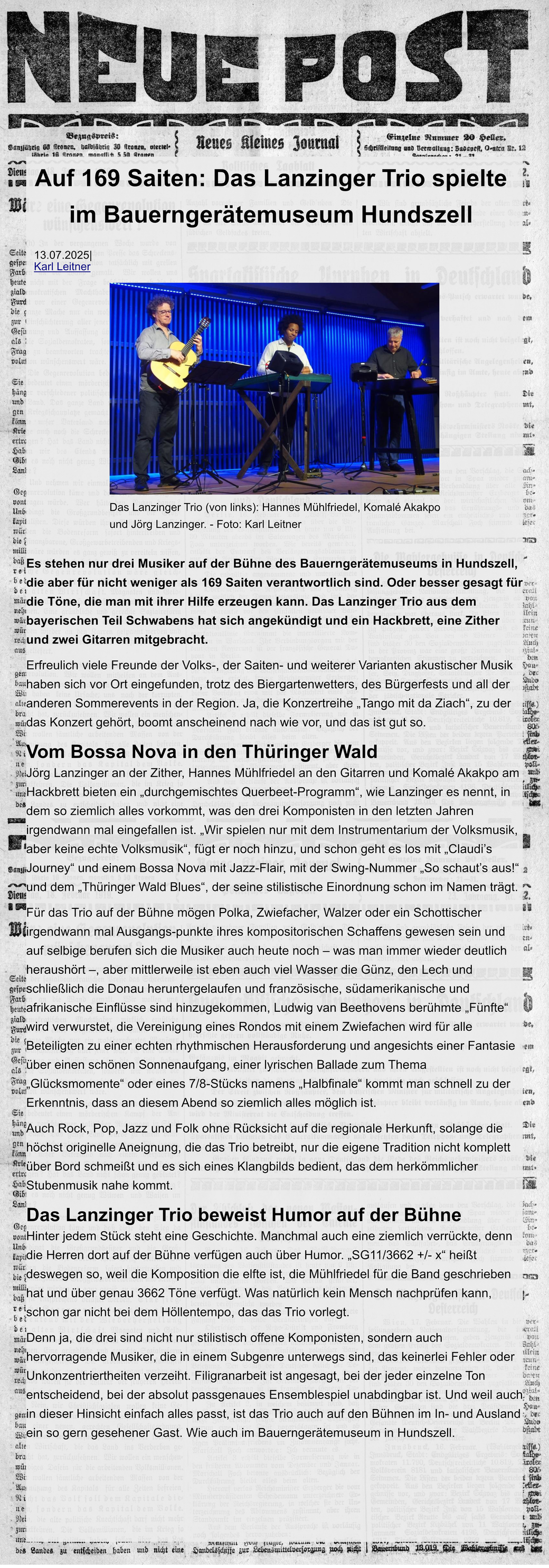 13. Juli 2025 Tango mit der Ziach Auch ohne Ziach wurden wir wieder ins Bauerngerätemuseum Hundszell zur Konzertreihe eingeladen. Tolle Location und wunderbares Publikum, Danke! tagPlaceholderTags: Kommentar schreiben Kommentare: 0